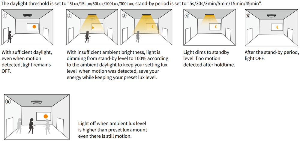 Zahvaljujoč tehnologiji dual-PD lahko senzor MC004-S02R razlikuje med naravno in umetno svetlobo LED. Senzor bo vklopil vaše svetilke, ko je svetloba okolice nižja od nastavljene vrednosti, tudi če ni zaznanega gibanja. Ko je ambientalna svetloba na nastavljeni vrednosti, bo senzor izklopil svetlobna telesa, tudi če je še vedno gibanje.