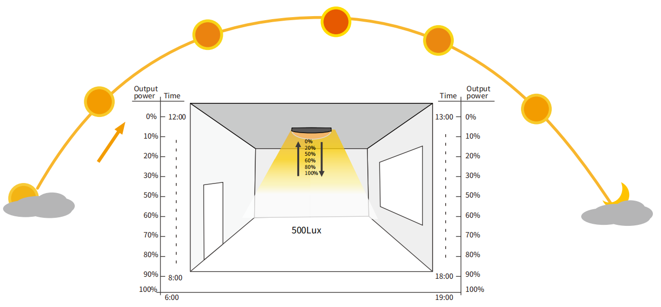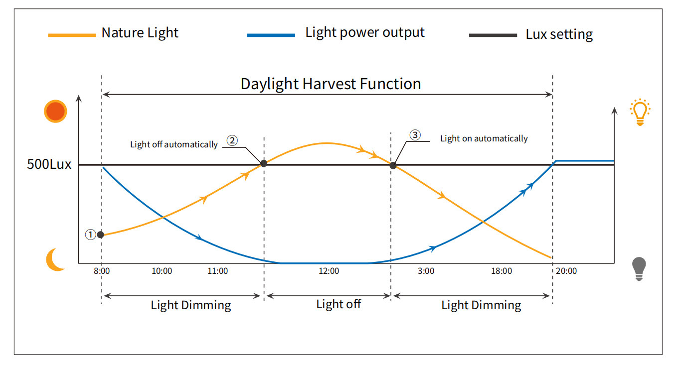 2. Funkcija samodejnega vklopa/izklopa Lux + funkcija žetve dnevne svetlobe
