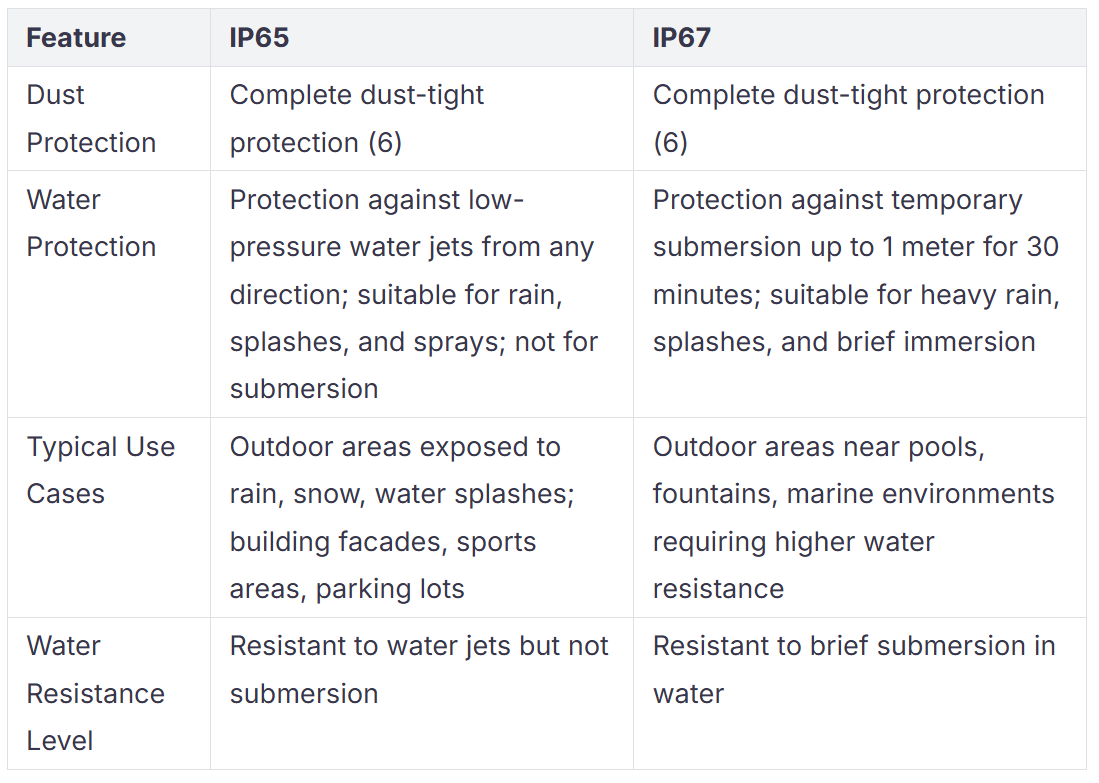 Pred nakupom luči vedno poglejte oceno IP. Za večino dvorišč je IP65 primeren za dež in prah. Če so vaše luči blizu bazenov, izberite IP67 za večjo zaščito pred vodo. To pomaga, da vaše luči dobro delujejo v slabem vremenu.