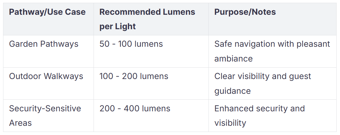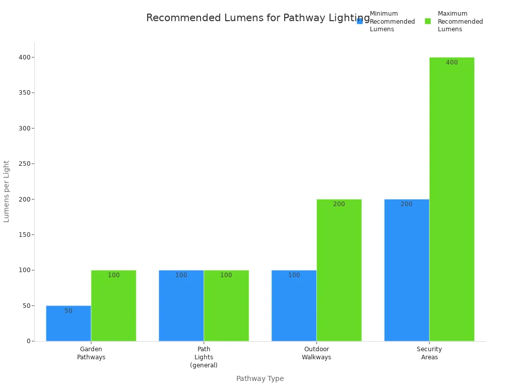 Pomembno je, da imamo zunaj varne poti. Osvetlitev poti ljudem pomaga videti, kam hoditi. Prav tako preprečuje spotikanja in padce. Za vrtne poti uporabite luči s 50–100 lumni. Za dobro svetlobo na prehodih potrebujete 100–200 lumnov. Če želite večjo varnost, uporabite 200–400 lumnov na luč. Za enakomerno svetlobo postavite zunanje led luči 6–8 čevljev narazen. Ozke poti potrebujejo luči bližje skupaj. Široke poti imajo lahko luči dlje narazen. Luči postavite približno 14 centimetrov nad tlemi. To daje neposreden žarek in naredi pot lepo videti.