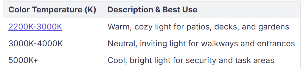 Izbira prave barvne temperature spremeni občutek in delovanje vašega prostora. Topla svetloba, od 2200K do 3000K, naredi prostore prijetne in prijetne. Uporabite to za terase, krove ali vrtove, kjer se želite sprostiti ali zabavati s prijatelji. Nevtralna bela, med 3000K in 4000K, daje jasno svetlobo, ki ni premočna. To je dobro za prehode in vhode, tako da lahko dobro vidite, ne da bi si poškodovali oči. Hladna bela, nad 5000 K, je zelo svetla in ostra. Uporabite to za varnostno razsvetljavo ali mesta, kjer morate vse jasno videti.