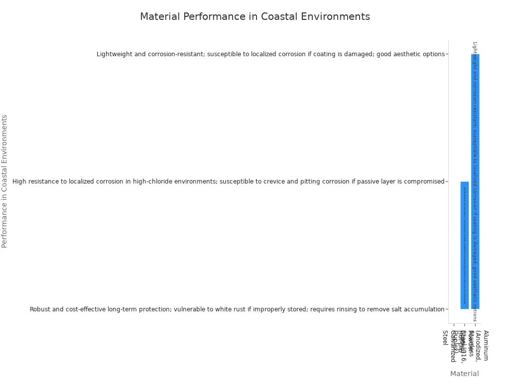 Proizvajalci uporabljajo zaključne premaze s praškastim premazom in zatesnjene pokrove, da podaljšajo življenjsko dobo luči. Te funkcije pomagajo svetlobi, ki je odporna na vremenske vplive, preživeti nevihte, moker zrak in slani prš. V spodnji tabeli si lahko ogledate, kako različni materiali delujejo v bližini morja: